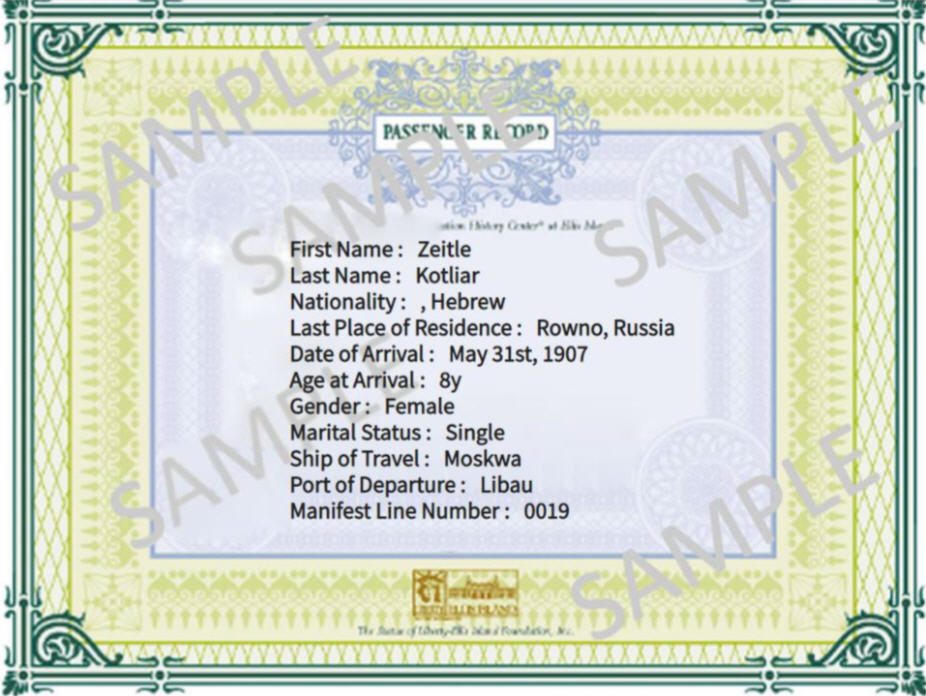 Sadie Zeitle Kotliar Immigration Papers 1907-05-31